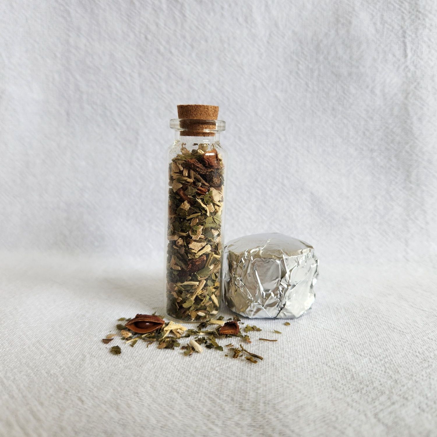 Each kit includes: 5g of blend in a glass jar with cork stopper & 2x charcoal discs, wrapped & tied in cloth.