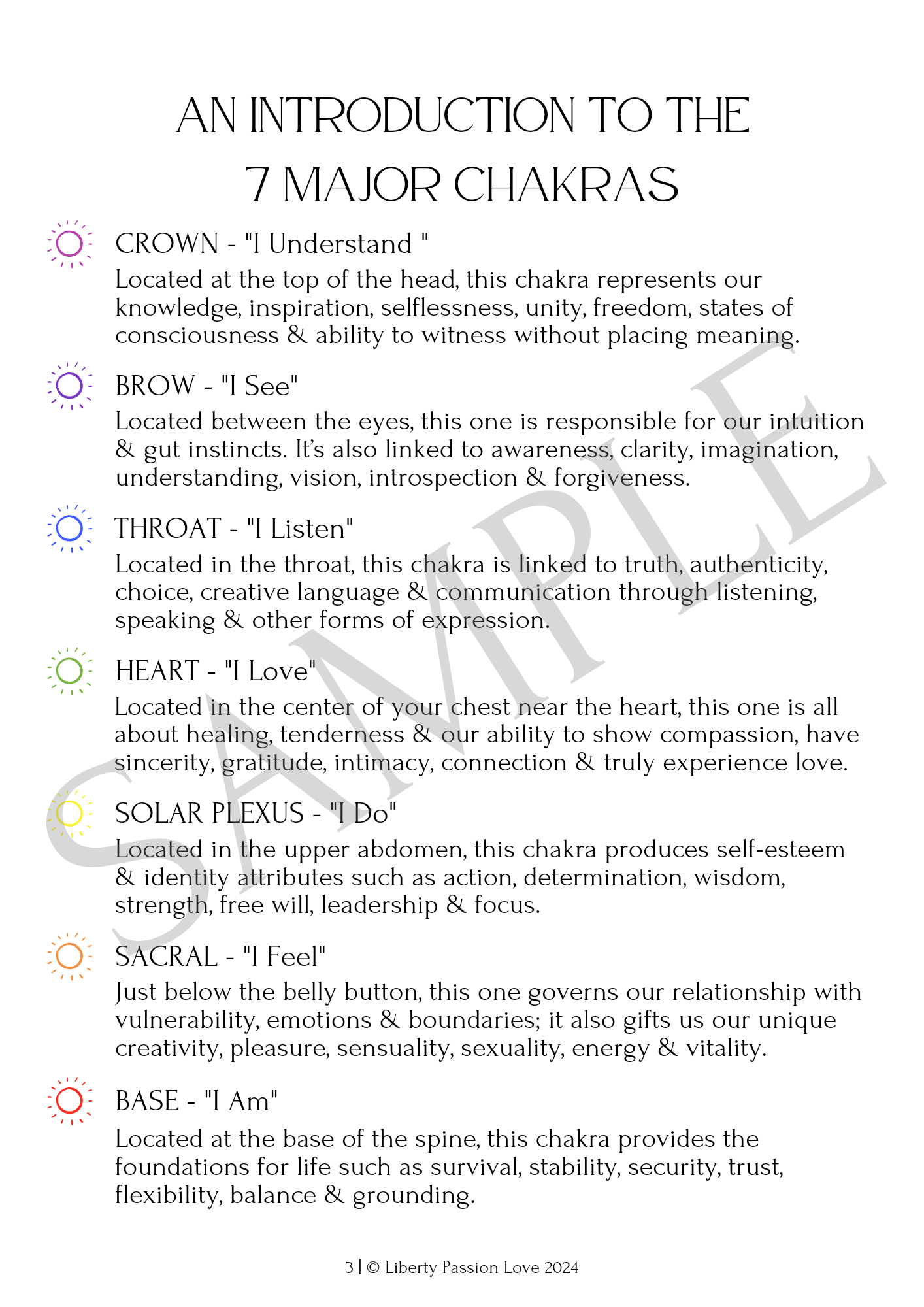 Description: This Digital Download is a brief Introduction into The 7 Major Chakras, their regions in both the physical body and face, along with a preview of Facial Zones – providing a snapshot of where our predominance currently is in relation to Mental, Emotional & Physical outputs, as well as how we ‘view/face’ our Feminine Inner & Masculine Outer Worlds.
